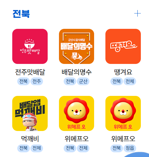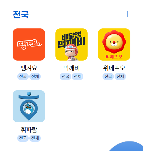 | 전국 | 땡겨요, 위메프오, 휘파람, 먹깨비 |