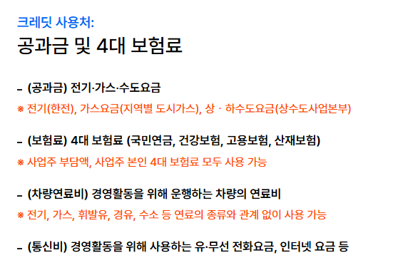 사업주 본인 부담금 및 사업주가 납부하는 직원 4대 보험료 모두 사용 가능 - 차량 연료비 : 사업 운영에 사용하는 차량의 주유비, 전기, 가스, 휘발유, 경유, 수소 등 모든 연료 종류 가능