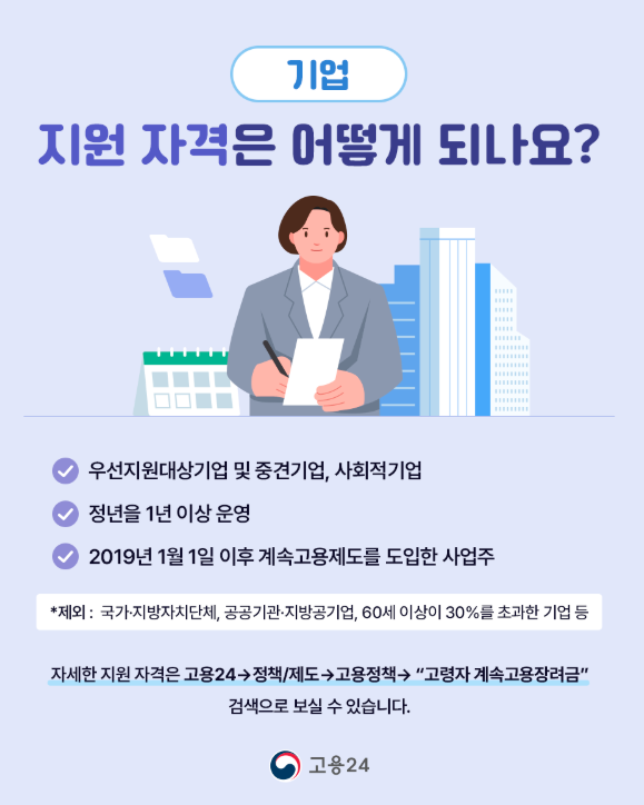 - 기업 로그인 → 기업지원금 → 고용유지 → 고령자 계속고용장려금
