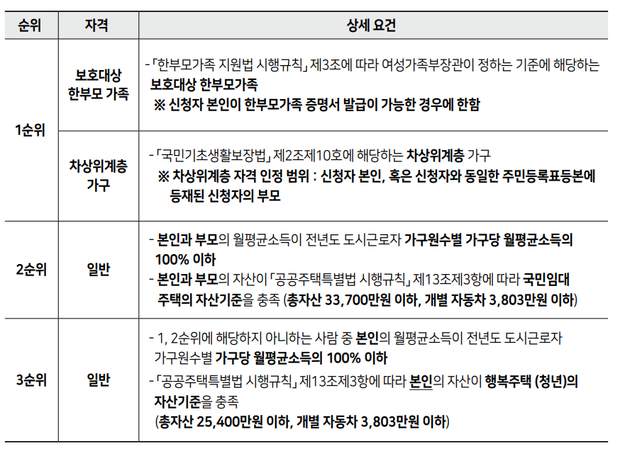 - 소득 요건: 전년도 도시근로자 월평균 소득 100% 이하, 1순위: 생계·의료·주거급여 수급자, 보호대상 한부모 가족, 차상위 계층 등 우선