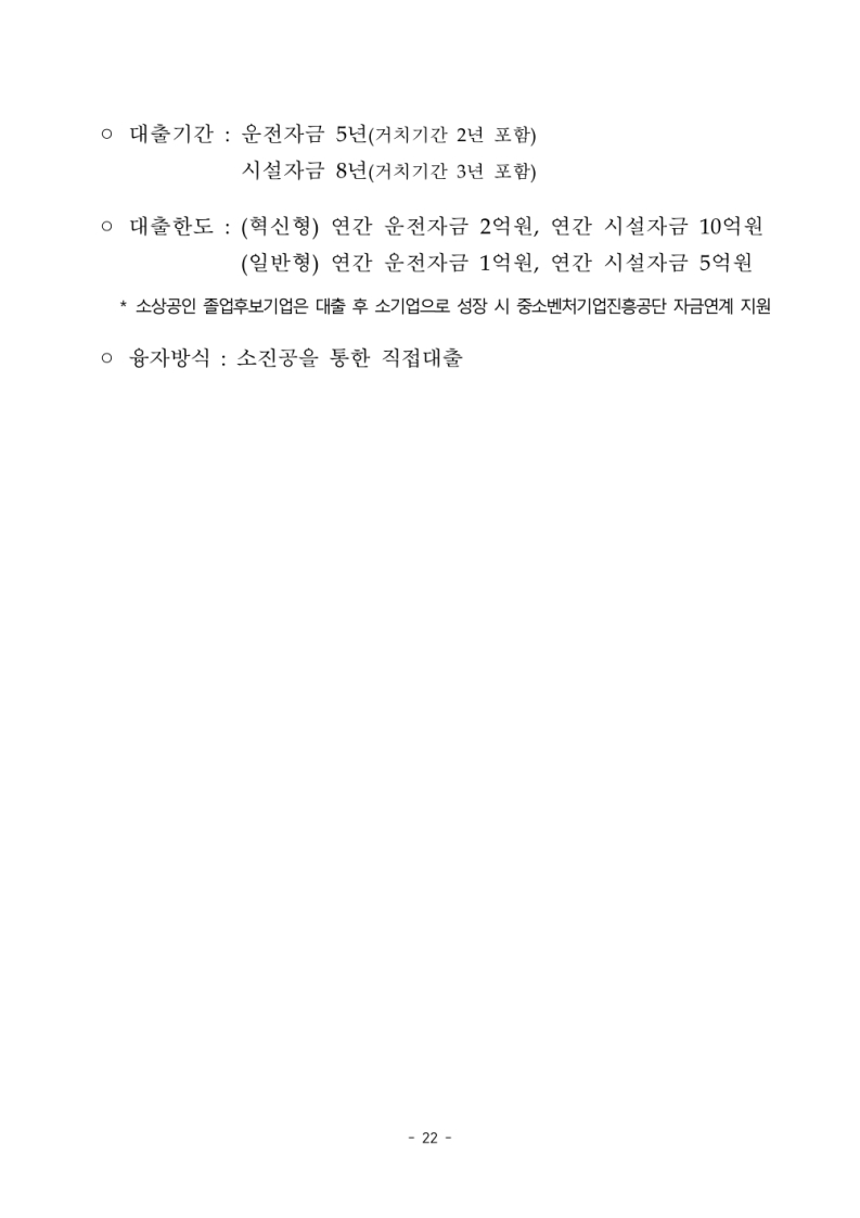 | 대출한도 | 혁신형: 연간 운전자금 2억 원, 시설자금 10억 원 일반형: 연간 운전자금 1억 원, 시설자금 5억 원 |